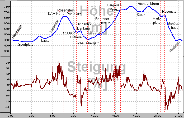 Länge = 24,5km Fahrzeit = ca.100Min Höhenmeter = 652 Max.Steigung = 25%